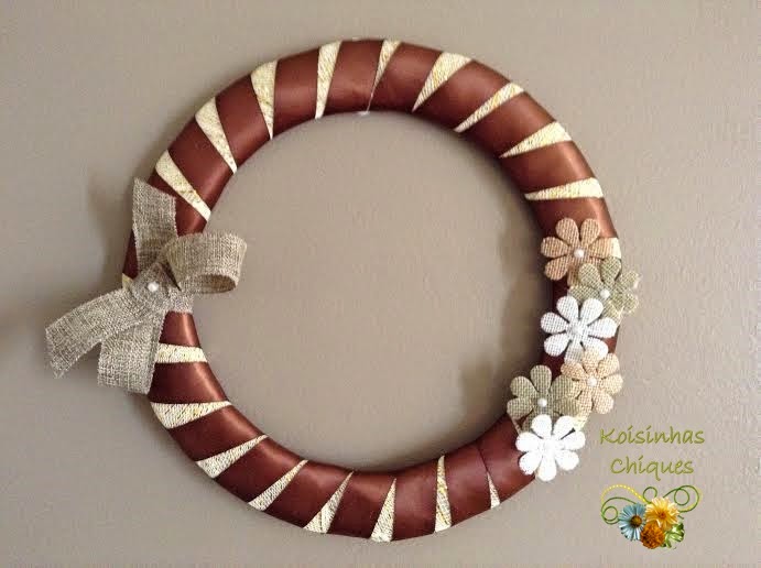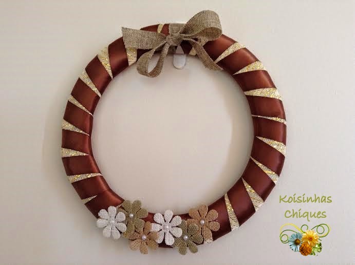 Retirei as folhas, bolas e pinhas e coloquei umas florzinhas, fita de cetim marrom, uma fita de juta e pérolas.