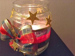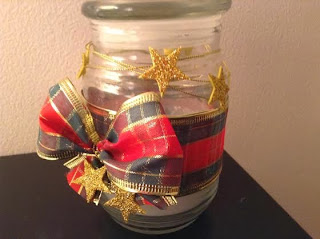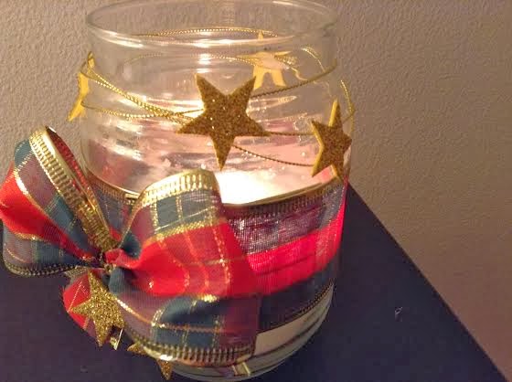 Usei para decorar o vidro: fita natalina, estrela com glitter, fio dourado e vela perfumada.